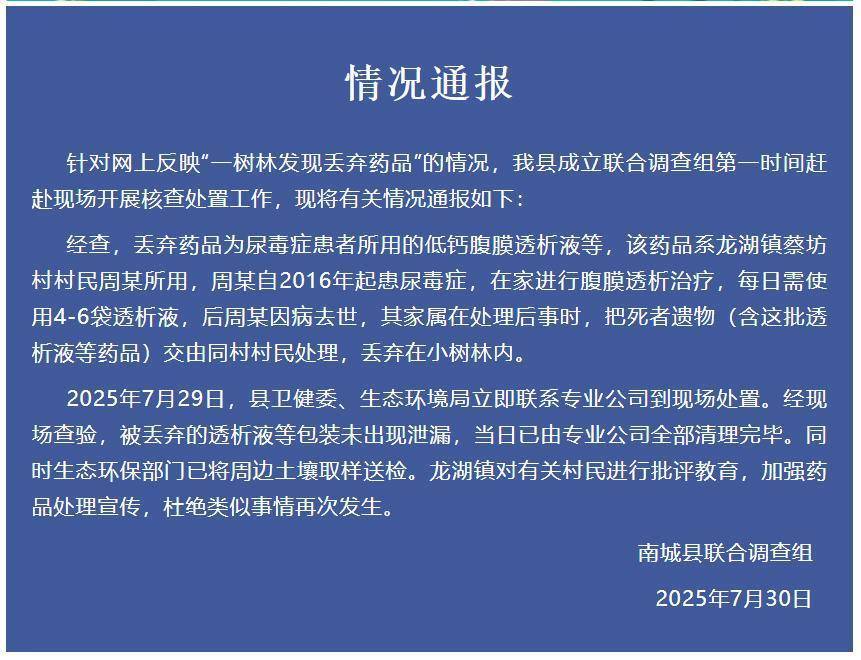 2025年7月29日,县卫健委、生态环境局立即联系专业公司到现场处置。经现场查验,被丢弃的透析液等包装未出现泄漏,当日已由专业公司全部清理完毕。同时生态环保部门已将周边土壤取样送检。龙湖镇对有关村民进行批评教育,加强药品处理宣传,杜绝类似事情再次发生。